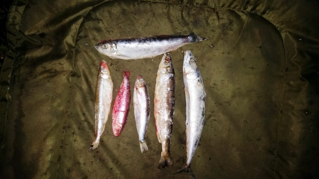 Jeśli łowię z „rzutu” to mając do dyspozycji przeważnie 3 zestawy staram się przynajmniej na początku „zasiadki” obłowić kilka interesujących miejsc. Zawsze co najmniej jeden zestaw „wędruje” jak najdalej od brzegu. Pozostałe w zależności od efektów – bliżej lub dalej. Przynęty jakie stosuję to przede wszystkim ryby morskie (śledź, makrela, sardynka) ale dobre efekty mam też na kawałki węgorza czy też na pstrąga.